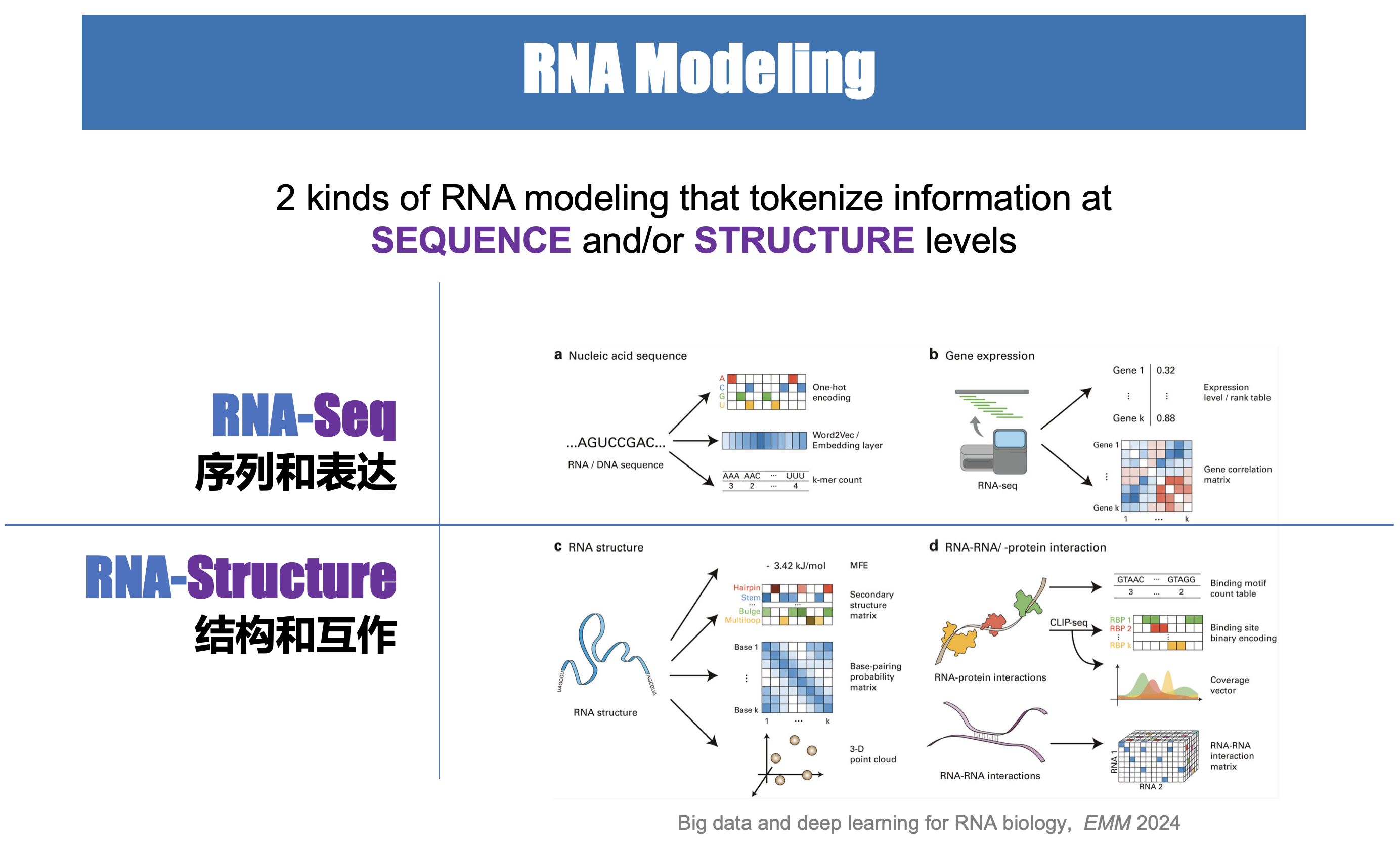 我们利用最新的人工智能技术从“序列”和“结构”两个不同的表征层面开发各类核酸模型,去发现和理解RNA在复杂的生物分子互作和调控网络中的作用和机制。
