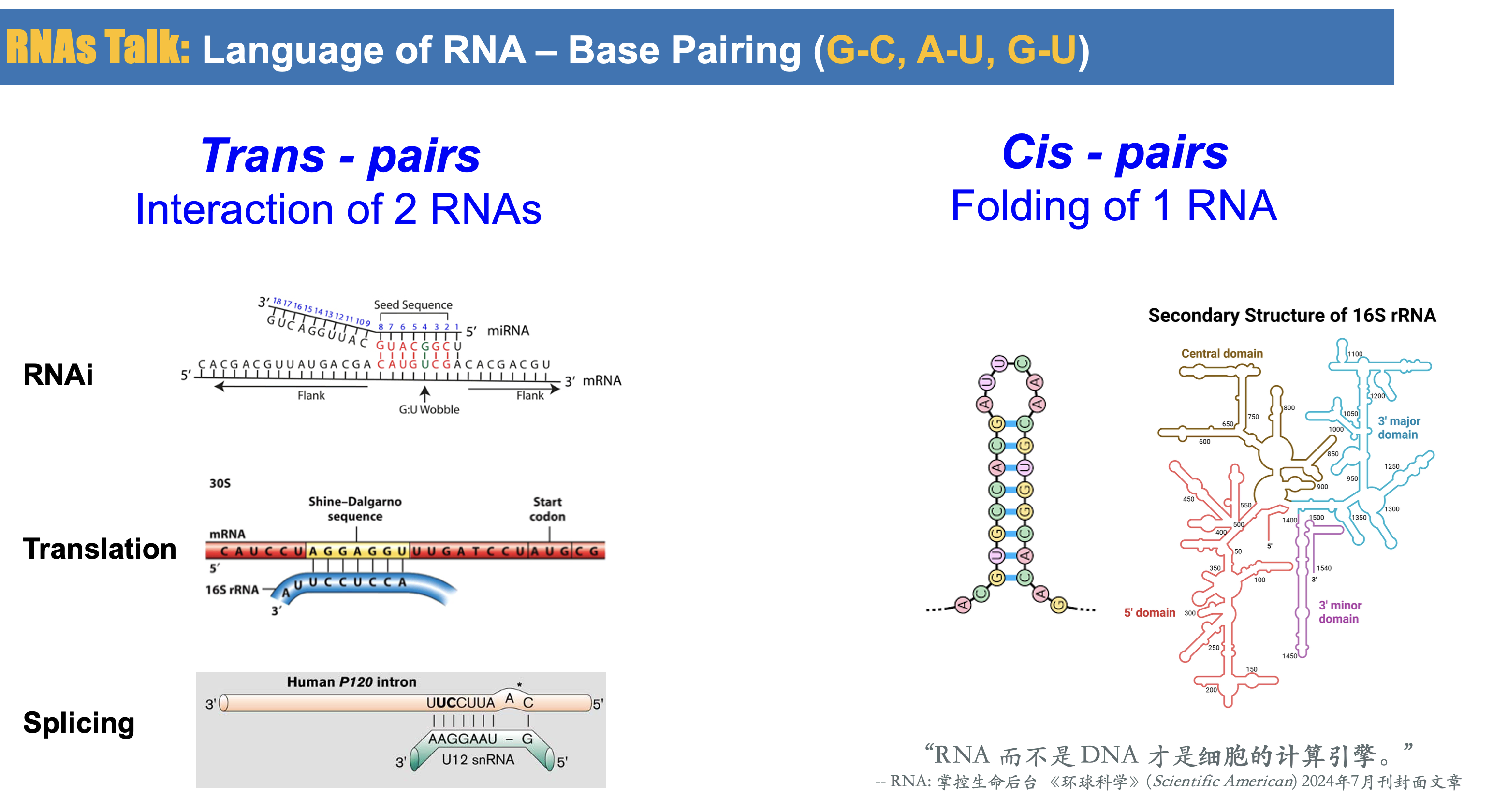 RNA Design: 不同领域的新方法和新思维的引入,往往能带来本学科的突破性进展,所以我们尤其注意将最新的计算领域的新技术和新思维(例如基于大语言模型的新型 AI 技术)引入到生物数据的研究上。我们针对RNA,尤其是 非编码 RNA (ncRNA),的结构、调控和靶标等问题,开发新型的核酸模型。最终,这些新型的模型将会带领我们进入一个崭新思维的酶设计、疫苗设计和药物设计的新时代。