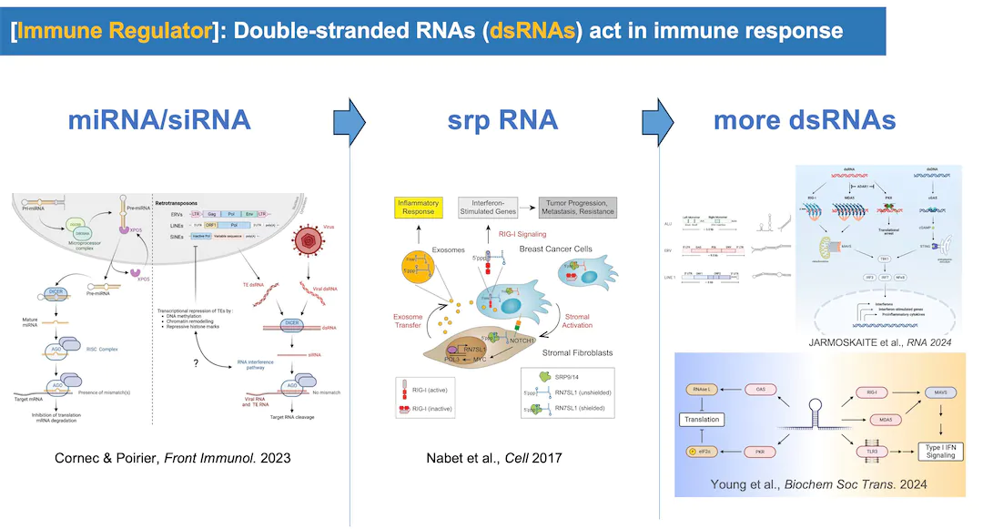double-stranded RNA (dsRNA): 著名的非编码RNA有miRNA/siRNA/piRNA这三类small RNA,他们是通过双链RNA(dsRNA)加工生成的不同RNA类型。双链RNA(double stranded RNA, dsRNA)是一种由两条互补RNA链组成的分子,RNA干扰的启动通常需要双链RNA(dsRNA),这些双链RNA可以是外源(如病毒)引入的,也可以是内源(如人类基因组里的重复序列)产生的。随着科研的进展,人们发现双链RNA(dsRNA)远不止上述3种。这些不同的dsRNAs在免疫系统中具有重要作用,尤其是在抗病毒和抗肿瘤免疫反应中。比如,srpRNA就通过癌症微环境的外泌体运输发挥细胞间的调控功能。