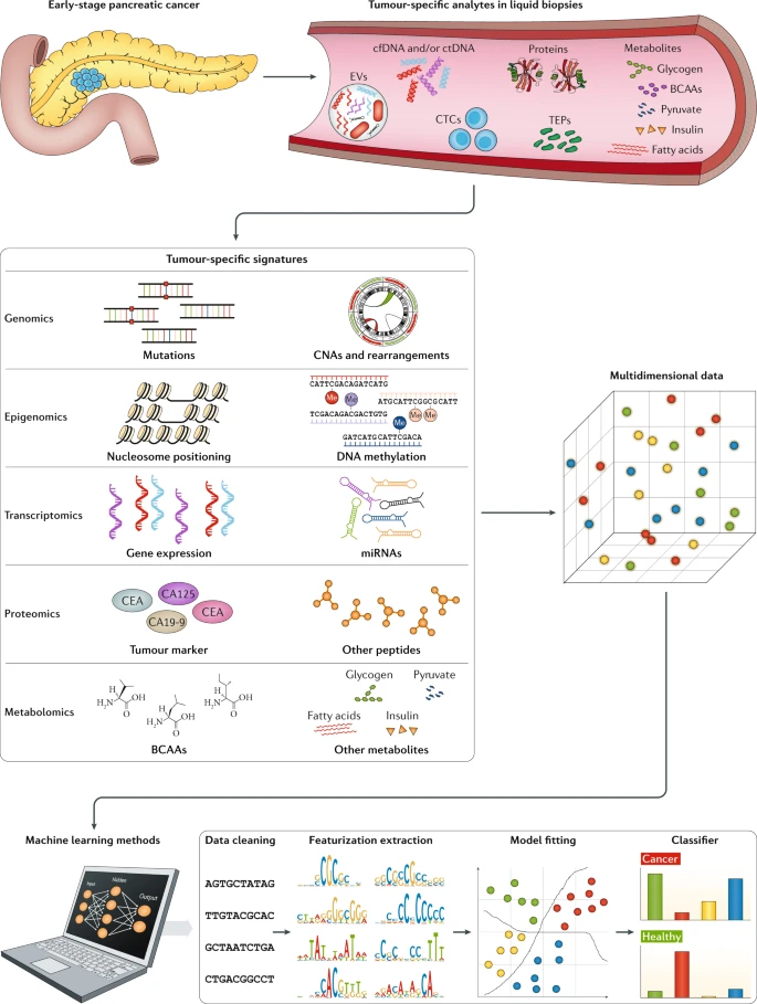 Multi-modal data integration: 我们可以由cfRNA-seq等高通量测序方法通过生物信息分析计算得到多模态数据(例如表达、剪接、编辑、融合等)。对于这些多维度、多模态的高通量数据(例如 cfRNA-seq分析得到的多模态数据,以及multi-omics数据),我们需要进行4个步骤来进行机器学习等分析,包括 1) Data Cleaning, 2) Feature extraction and engineering, 3) Model Fitting, 4) Classifier。我们针对这4个步骤开发相应的生物信息学方法、软件、数据库等工具,例如,我们探索和利用大语言模型和深度学习模型等新型AI 技术,进行多模态数据整合。