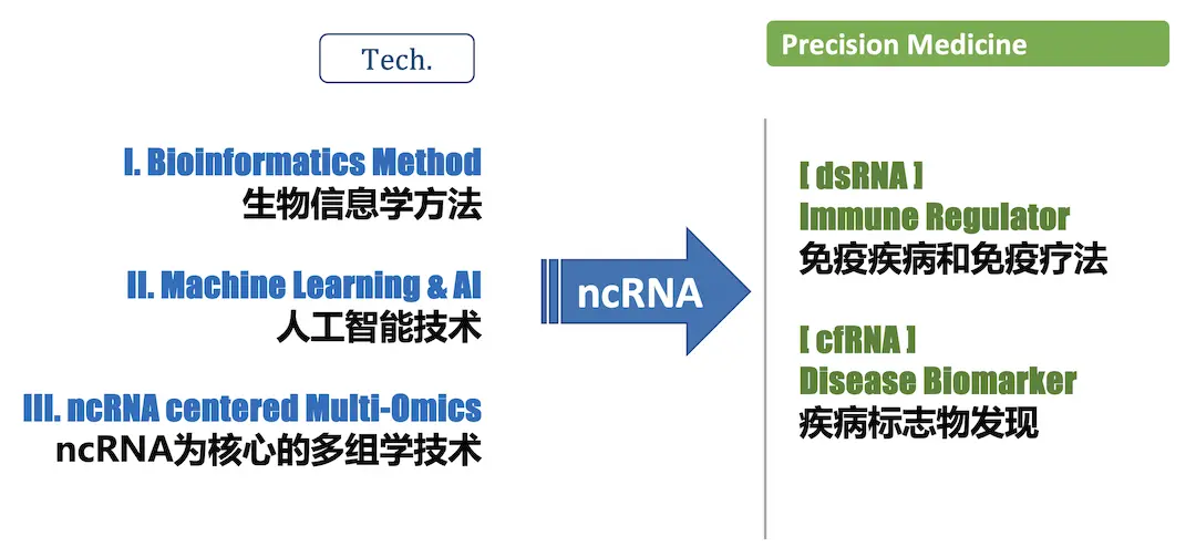 我们围绕非编码 RNA(ncRNA)在两个主要的科研方向上进行探索和研究:I. 生信驱动的精准医疗;II. AI驱动的核酸模型和药物设计。